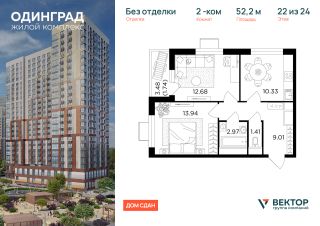 Прямая продажа от застройщика. Продается 2-комн. квартира площадью 52,2 кв.м на 22 этаже 24 этажного дома в ЖК "Одинград" от федерального девелопера ГК "Вектор".