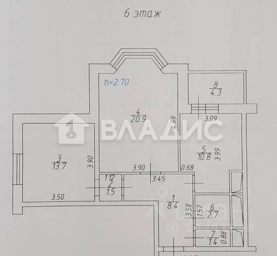 Общая площадь квартиры без учета лоджии по ЕГРН 59.4 кв.м, плюс площадь лоджии 4.3 кв.м, комнаты изолированные 20.9 кв.м и 13.7 кв.м, санузел совмещенный, большая кухня 10.8 кв.м плюс лоджия 4.3 кв..м.
