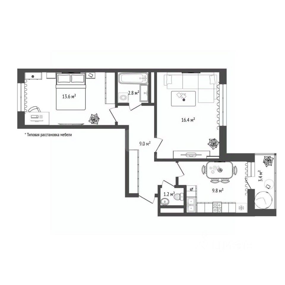 Просторные комнаты: Общая площадь 53,7 м². Изолированные комнаты 16,4 м² и 13,7 м², кухня 9,8 м². Просторный коридор 9м2 и раздельный санузел.