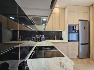 Над квартирой поработал пофессиональный дизайнер! В оформлении интерьена использованы качественные материалы природной цветовой гаммы, керамогранит в санузле, вусококлассный ламинат на полу в комнатах. Планировочное решение выполнено с учетом потребностей семьи из двух человек. Зонирование состоит из отделной спальни, отдельно зонированной кухни и гостиной-телевизионной зоны. Большой санузел. Продуманы места хранения (два встроенных шкафа в один из которых спрятана стиралная машина, гардеробная комната), огромная встроенная кухня со встроенной техникой фирмы Weissgauff, с удобно продуманным освещением. Использована ежиная концепция освецения и самих светильников.