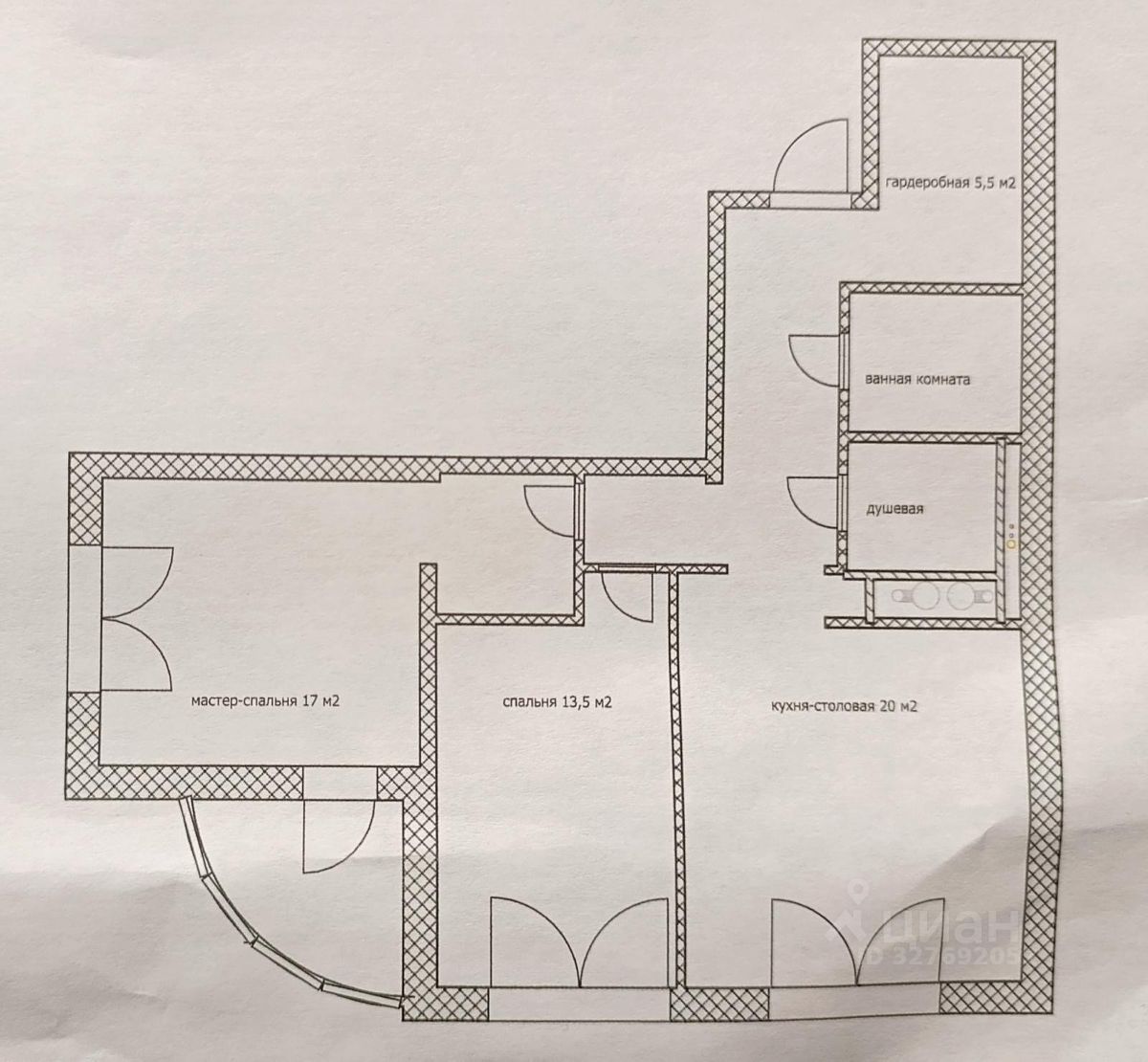 две комнаты по 17 и 13,5 кв м , а кухня-гостиная площадью 20 кв. м, гардеробная 5,5, балкон 4,3 кв м .
