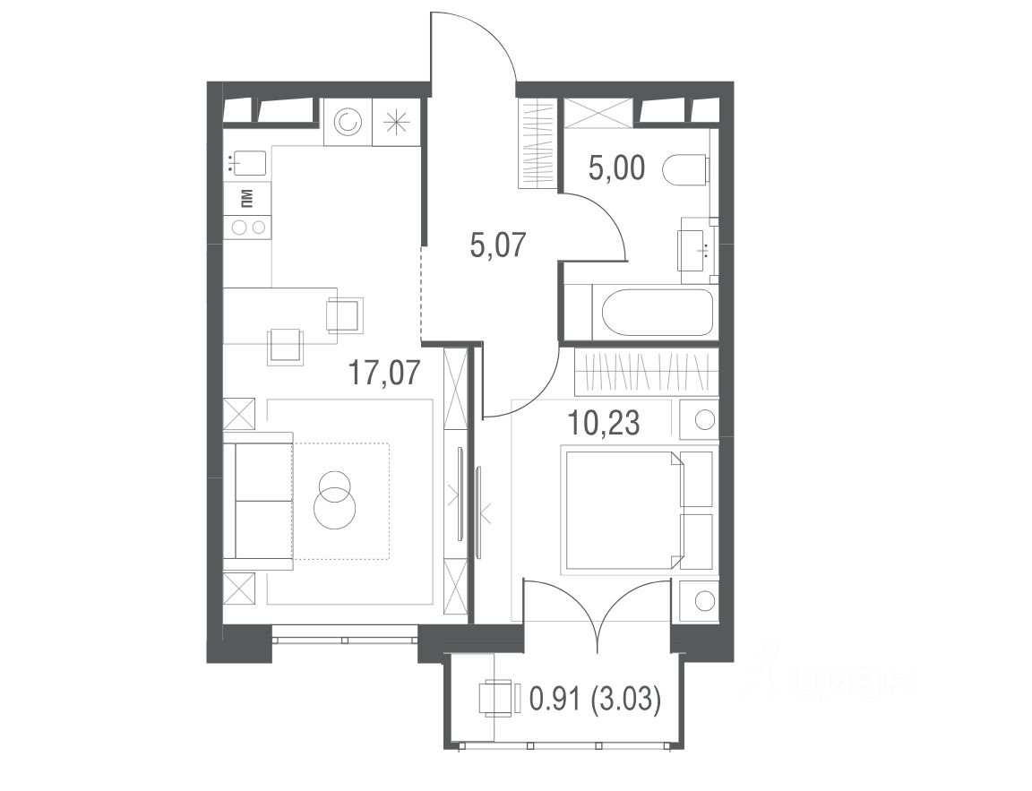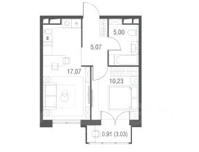 Общая площадь квартиры 38,3 кв. м, площадь комнат: 10,23 кв. санузел - совмещенный, балкон, кухня-гостиная 17,07.
