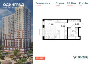 Прямая продажа от застройщика. Продается квартира-студия площадью 26,2 кв.м на 21 этаже 24 этажного дома в ЖК "Одинград" от федерального девелопера ГК "Вектор".