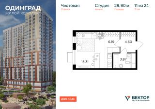 Прямая продажа от застройщика. Продается квартира-студия площадью 29,9 кв.м на 11 этаже 24 этажного дома в ЖК "Одинград" от федерального девелопера ГК "Вектор". Расположение Запад Одинцова — район с чистым воздухом, лесопарками, спортивной инфраструктурой и удобным выездом в Москву. Транспортная доступность Собственный выезд на М-1. 10 минут до Москвы, 20 — до Москва-Сити. Общественным транспортом: 30 минут до метро, 40 — до Киевского вокзала. Инфраструктура На территории — два детских сада, своя школа, магазины, супермаркеты, аптека, стоматология, салоны красоты, кафе, студия йоги, барбершоп, химчистка. В шаговой доступности — престижные школы (СОШ 9, СОШ 12, Одинцовская гимназия 13), лицеи, гимназии, включая филиал МГИМО, Ледовый дворец "Армада", шахматная школа, волейбольный центр, спорткомплекс с тренажерами.*