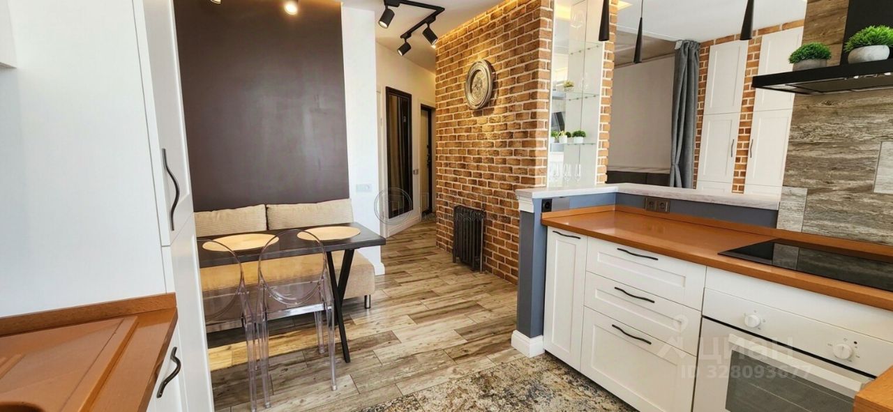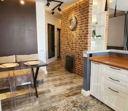 — Дизайнерский ремонт с использованием качественных материалов, сочетание декоративного кирпича, натуральных оттенков и мягкого освещения