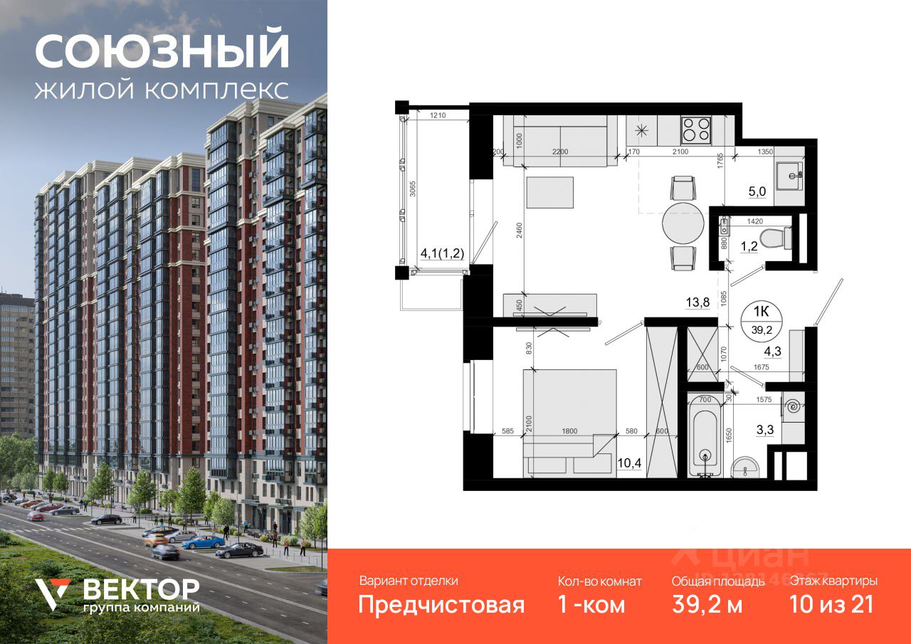 Продается 1-комн. квартира площадью 39,2 кв.м на 10 этаже 21 этажного дома в ЖК "Союзный" от федерального девелопера ГК "Вектор".