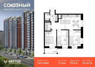 Продается 3-комн. квартира площадью 65,6 кв.м на 24 этаже 24 этажного дома в ЖК "Союзный" от федерального девелопера ГК "Вектор".