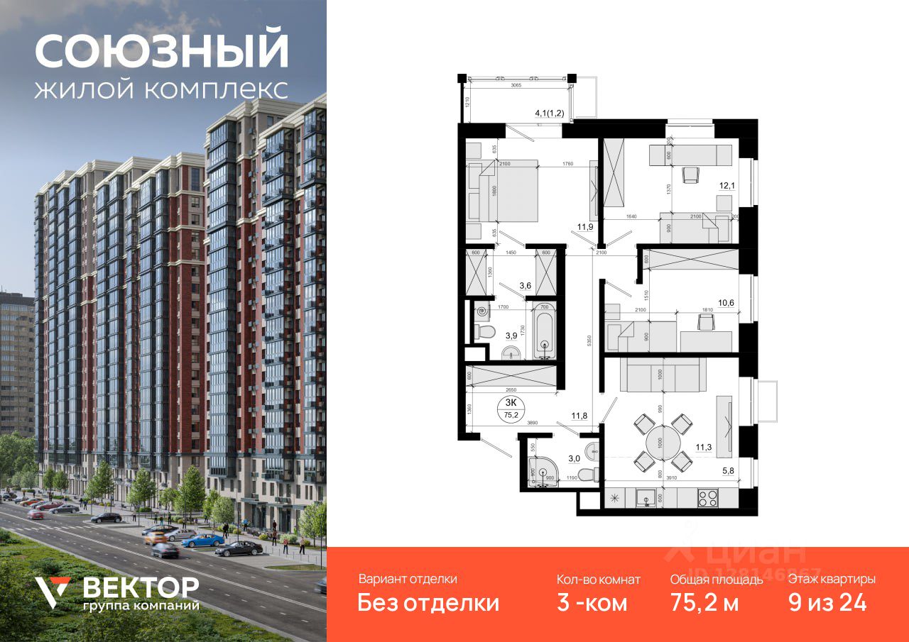 Продается 3-комн. квартира площадью 75,2 кв.м на 9 этаже 24 этажного дома в ЖК "Союзный" от федерального девелопера ГК "Вектор".