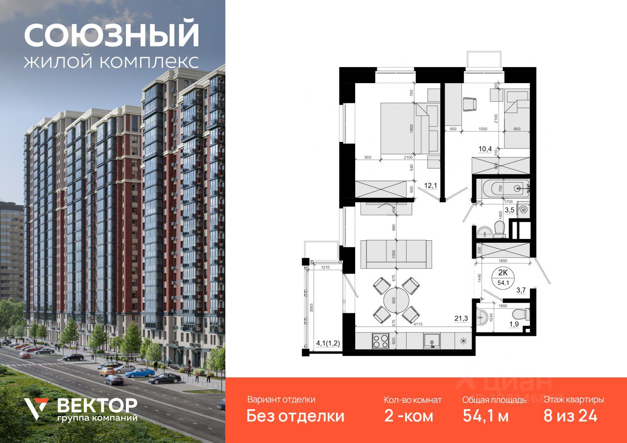 Продается 2-комн. квартира площадью 54,1 кв.м на 8 этаже 24 этажного дома в ЖК "Союзный" от федерального девелопера ГК "Вектор".