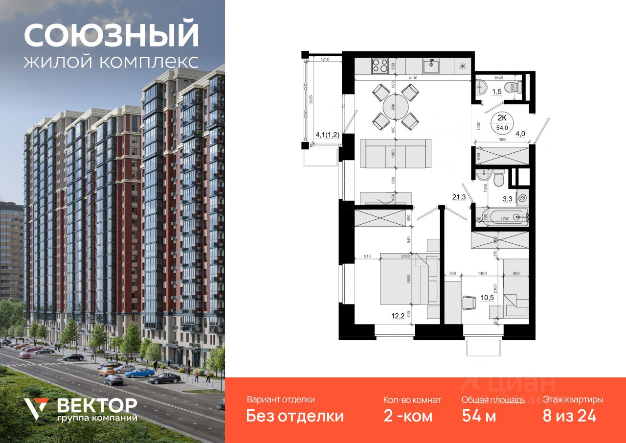 Продается 2-комн. квартира площадью 54 кв.м на 8 этаже 24 этажного дома в ЖК "Союзный" от федерального девелопера ГК "Вектор".