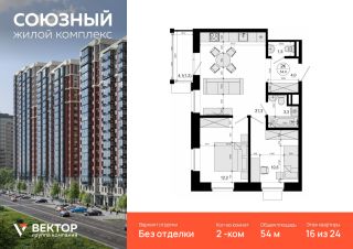 Продается 2-комн. квартира площадью 54 кв.м на 16 этаже 24 этажного дома в ЖК "Союзный" от федерального девелопера ГК "Вектор".