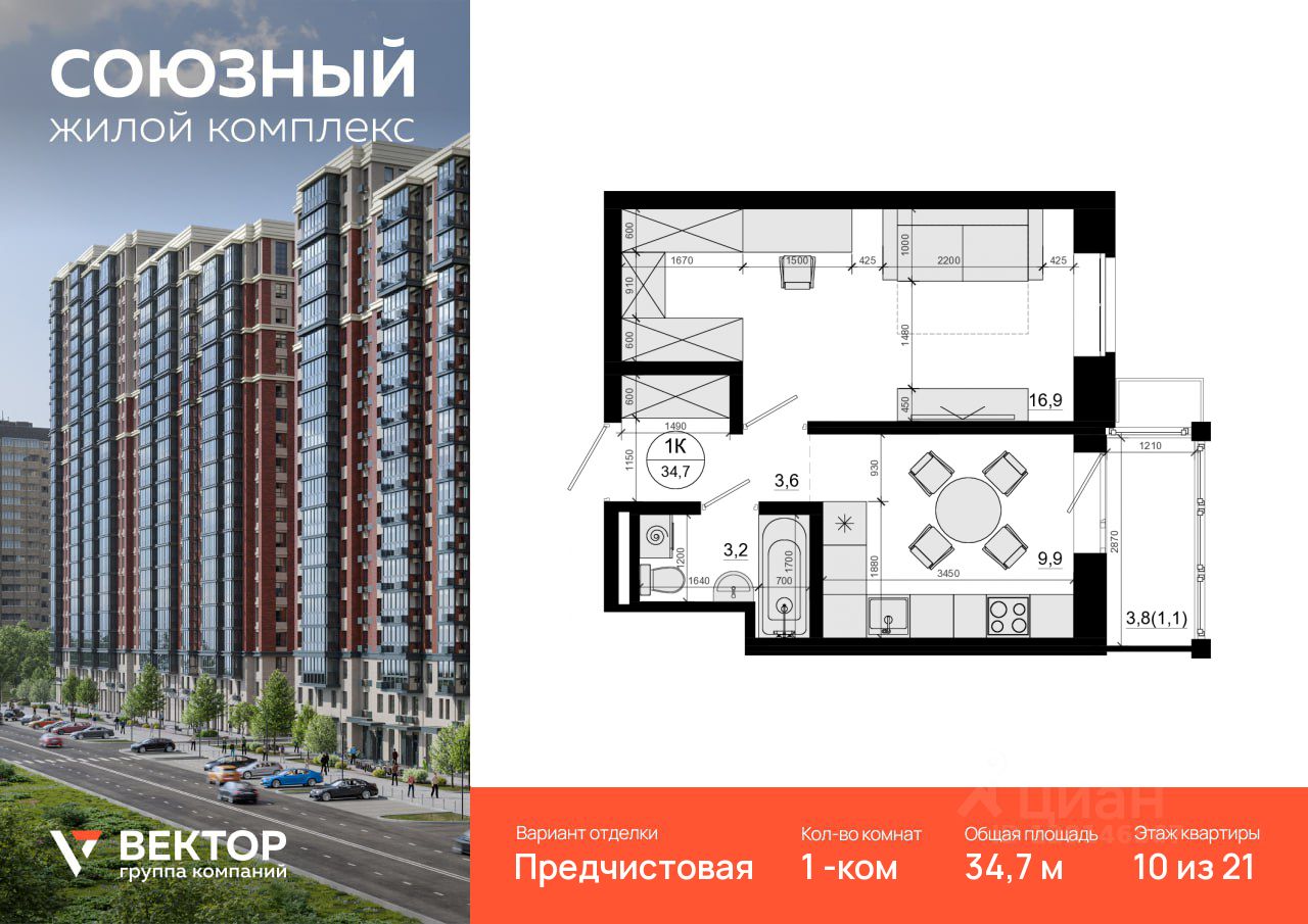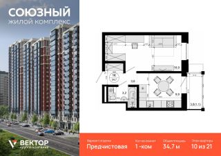 Продается 1-комн. квартира площадью 34,7 кв.м на 10 этаже 21 этажного дома в ЖК "Союзный" от федерального девелопера ГК "Вектор".