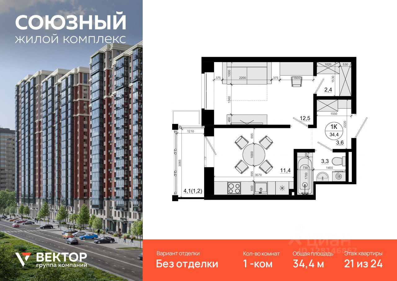Продается 1-комн. квартира площадью 34,4 кв.м на 21 этаже 24 этажного дома в ЖК "Союзный" от федерального девелопера ГК "Вектор".