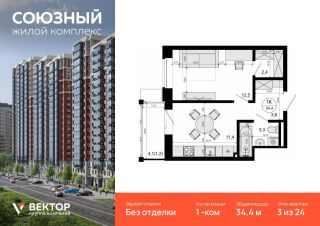 Продается 1-комн. квартира площадью 34,4 кв.м на 3 этаже 24 этажного дома в ЖК "Союзный" от федерального девелопера ГК "Вектор".