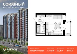 Продается квартира-студия площадью 29,3 кв.м на 8 этаже 21 этажного дома в ЖК "Союзный" от федерального девелопера ГК "Вектор".