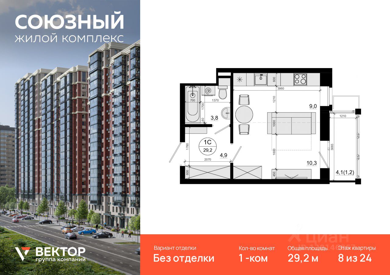 Продается 1-комн. квартира площадью 29,2 кв.м на 8 этаже 24 этажного дома в ЖК "Союзный" от федерального девелопера ГК "Вектор".