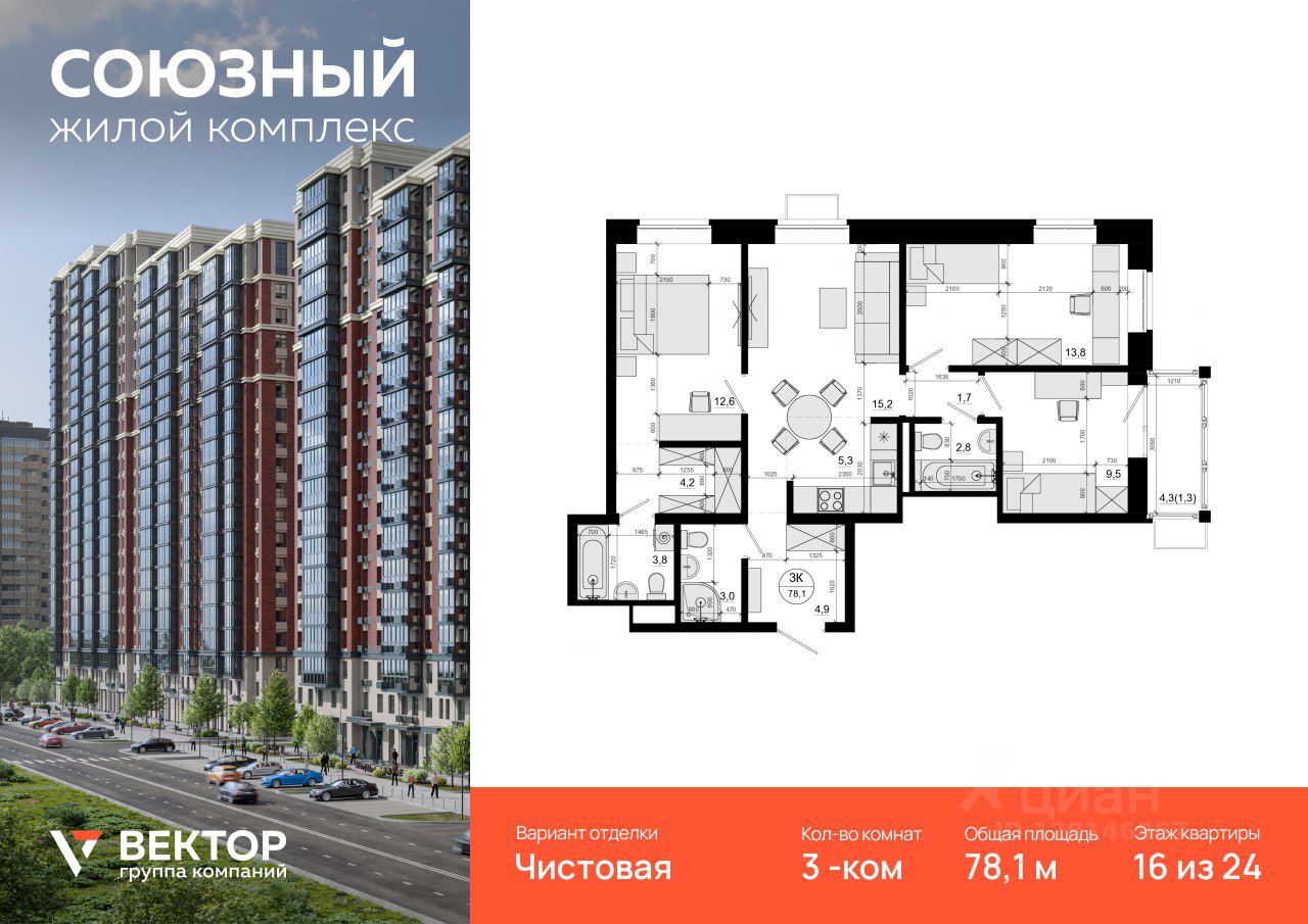 Продается 3-комн. квартира площадью 78,1 кв.м на 16 этаже 24 этажного дома в ЖК "Союзный" от федерального девелопера ГК "Вектор".