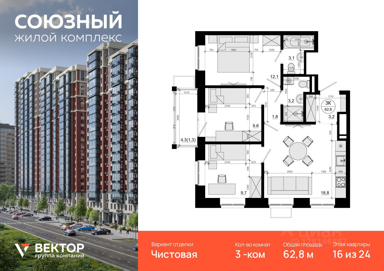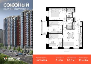 Продается 3-комн. квартира площадью 62,8 кв.м на 16 этаже 24 этажного дома в ЖК "Союзный" от федерального девелопера ГК "Вектор".