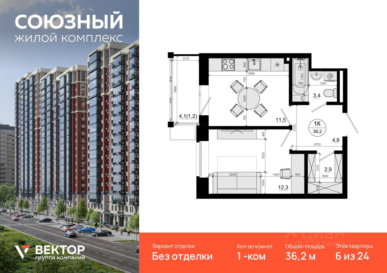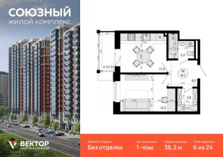 Продается 1-комн. квартира площадью 36,2 кв.м на 6 этаже 24 этажного дома в ЖК "Союзный" от федерального девелопера ГК "Вектор".