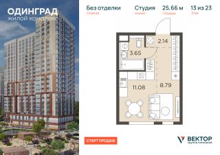 Прямая продажа от застройщика. Продается квартира-студия площадью 25,66 кв.м на 13 этаже 23 этажного дома в ЖК "Одинград" от федерального девелопера ГК "Вектор".