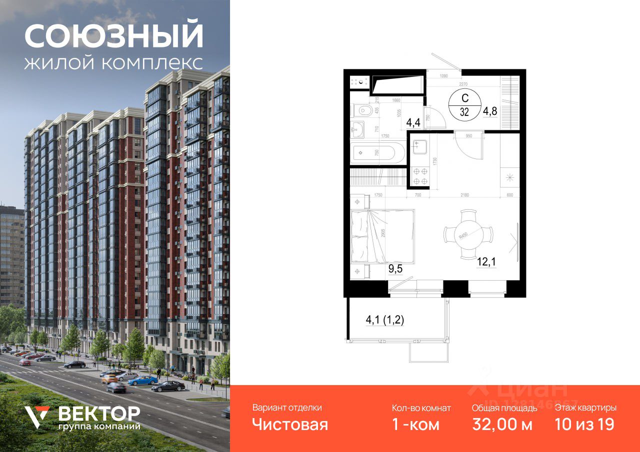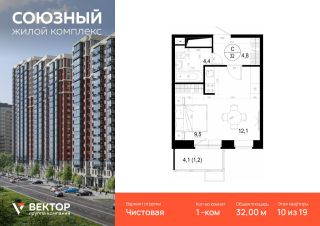 Продается 1-комн. квартира площадью 32 кв.м на 10 этаже 19 этажного дома в ЖК "Союзный" от федерального девелопера ГК "Вектор".