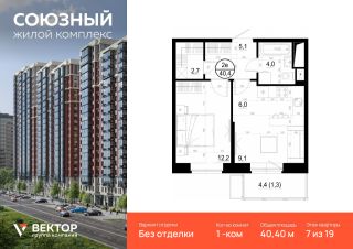 Продается 1-комн. квартира площадью 40,4 кв.м на 7 этаже 19 этажного дома в ЖК "Союзный" от федерального девелопера ГК "Вектор".