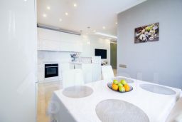 Из прихожей, с двумя встроенными шкафами, Вы попадаете в большую и светлую гостиную. Здесь традиционными атрибутами являются роскошный белый кожаный диван с нюансом - два крайних места раскладные с электроприводом функции "нулевой гравитации" (как в премиальных авто) и большой телевизор.