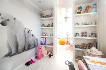 Детская комната разделена на две функциональные части - на игровую и спальню. В спальной части - кровать, комод, шкаф и телевизор. В игровой - встроенные системы хранения, письменный стол и кресло.