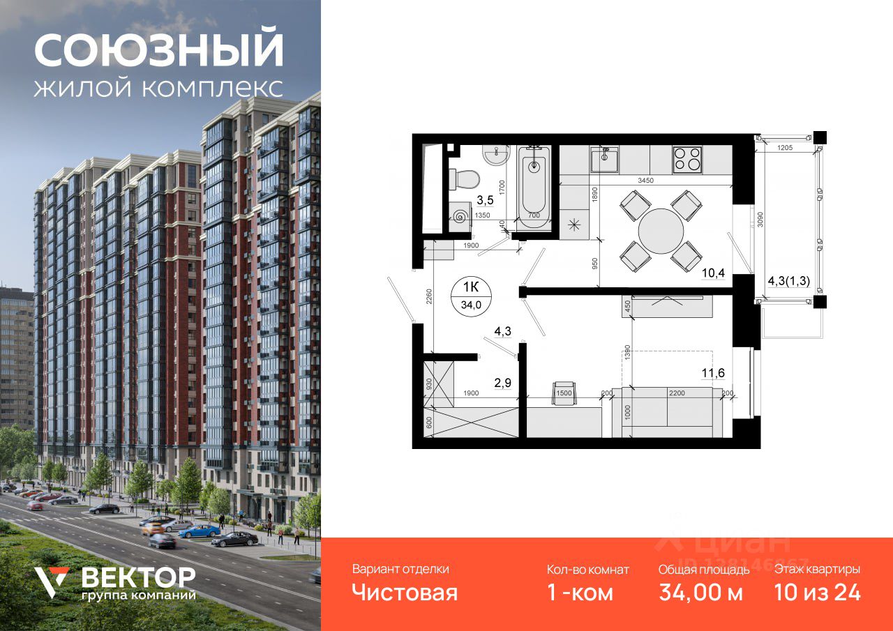 Продается 1-комн. квартира площадью 34 кв.м на 10 этаже 24 этажного дома в ЖК "Союзный" от федерального девелопера ГК "Вектор".