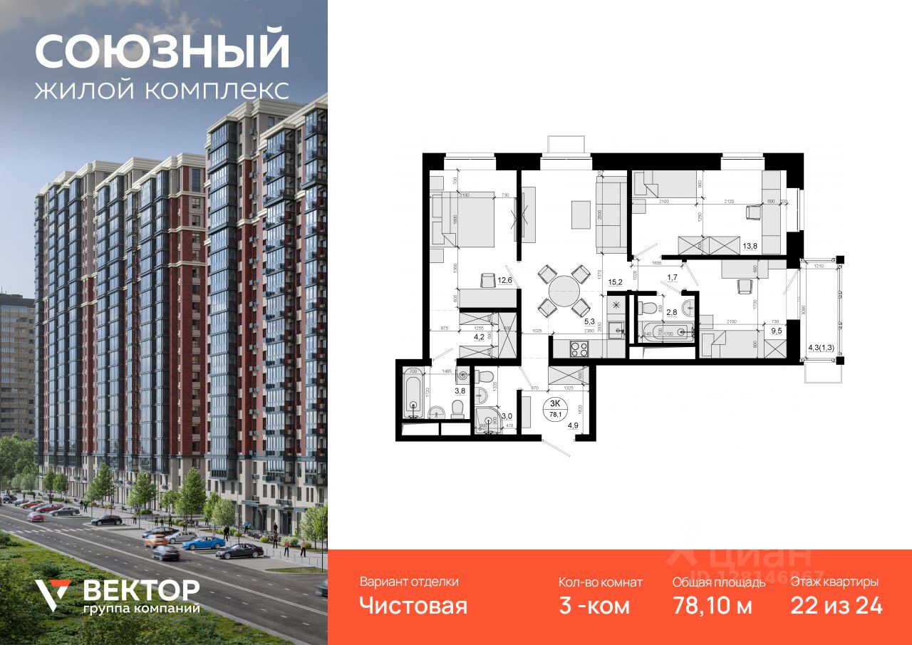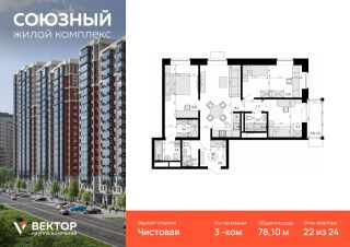 Продается 3-комн. квартира площадью 78,1 кв.м на 22 этаже 24 этажного дома в ЖК "Союзный" от федерального девелопера ГК "Вектор".