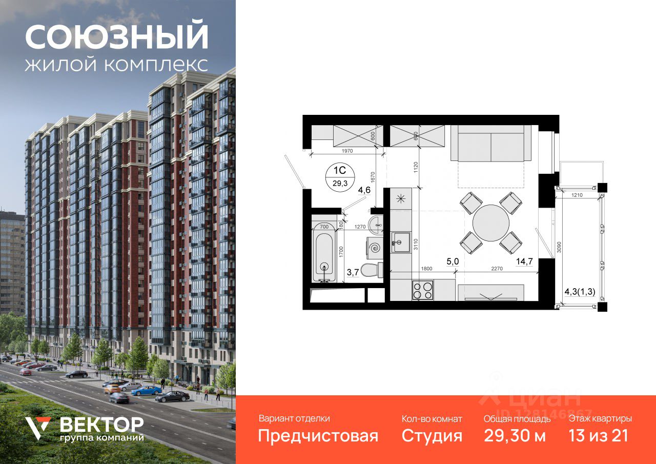 Продается квартира-студия площадью 29,3 кв.м на 13 этаже 21 этажного дома в ЖК "Союзный" от федерального девелопера ГК "Вектор".