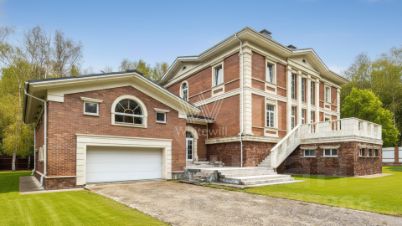 ПСК Барвиха. Большой загородный дом с бассейном, 5-ю спальнями и встроенным гаражом построен на прилесном участке 23 сотки. Фасад здания выполнен в английском стиле, облицован красным кирпичом, украшен рустовкой и колонным портиком. Двухэтажное здание гаража выполнено в едином стиле с главным домом и соединено с ним переходом. В резиденции можно выполнить любой дизайн-проект по своему вкусу, спланировать библиотеку, просторную каминную залу и спальни с большими окнами, гардеробными и санузлами. Общая площадь дома 1 100 м². На участке 23 сотки постелен газон.
