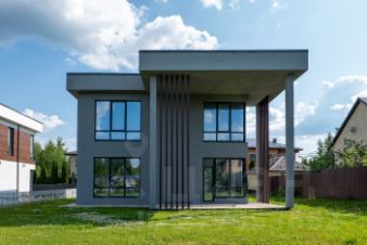 Экстерьер дома выполнен из декоративной штукатурки в темных строгих тонах графитового цвета.