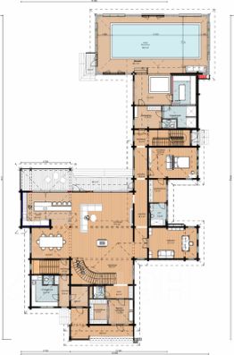Индивидуальный проект двухэтажного дома с цокольным этажом, общей площадью 1500 м2 предполагает 6 спален, домашний кинотеатр, тренажерный зал, бассейн и СПА-зону с сауной и джакузи.