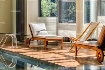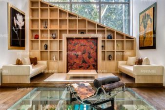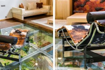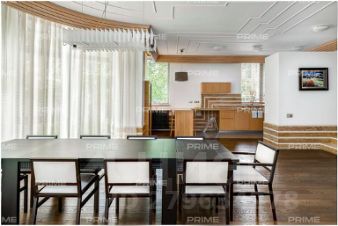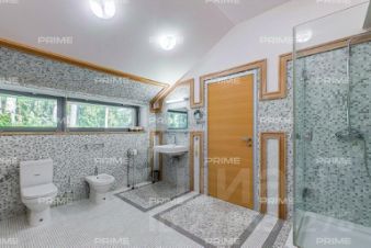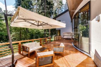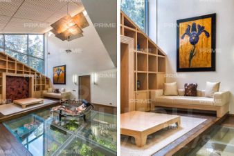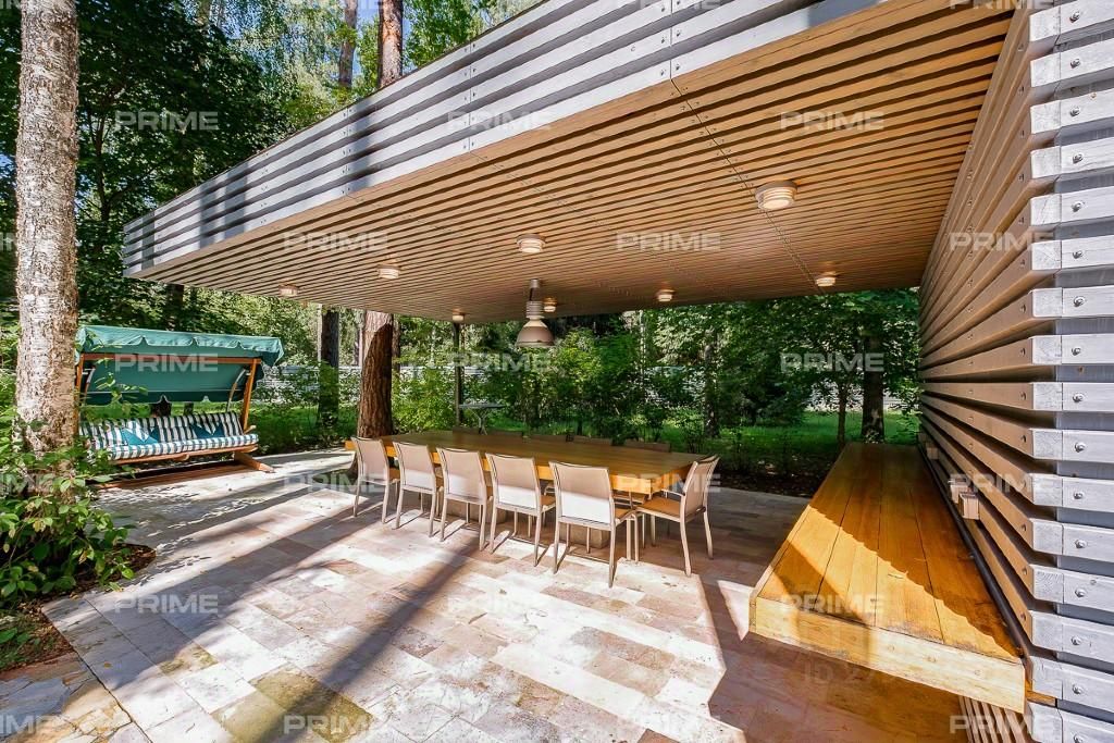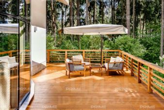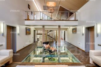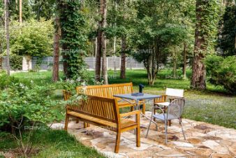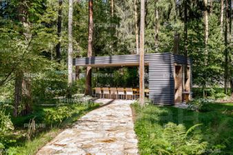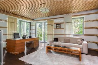 На территории участка выполнен ландшафтный дизайн с подсветкой, дорожками и системой полива. Интерьеры дома стремятся объединить внутреннее пространство и окружающий сосновый бор. Дом предлагается с дизайнерской отделкой "под ключ" и мебелью. В помещении 2 этажа, 3 спальни, гостиная с камином, аквазона с бассейном, сауной и зоной отдыха, зимний сад, а также квартира для персонала.