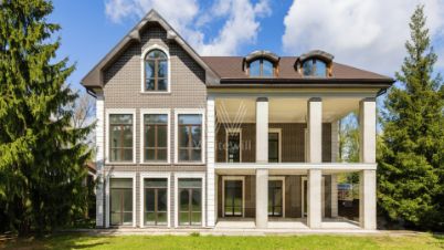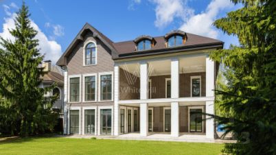 Барвиха. Просторный загородный дом площадью 1300 м² построен на ровном полевом участке 15 соток без ландшафтного дизайна. Фасад в европейском стиле облицован коричневой клинкерной плиткой и натуральным камнем по цоколю, декорирован белыми наличниками и колоннами. В коттедже без отделки спланировали несколько спален, гостиную, кухню, кабинет, кинотеатр, спортзал, парилку и гараж. Укрыться от солнца и отдохнуть на свежем воздухе можно в тени террасы с видом на участок или в беседке.