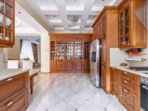 На первом этаже входная группа с большим тамбуром, холл с двумя гардеробными и гостевым с/у, гостиная с домашним кинотеатром и камином с выходом на террасу с зоной барбекю, кухня-гостиная. Кухня-натуральный дуб (индивидуальный проект), пол - плитка - везде установлен водяной подогрев пола. Вся техника-Miele;