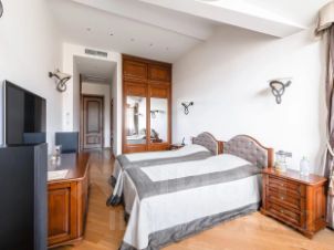 Внутри - высокие потолки 3,12 м., и дорогая мебель из Европы. Имеется 3 спальни, 4 с/у.