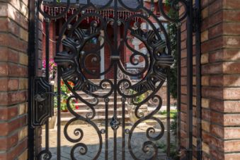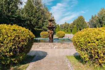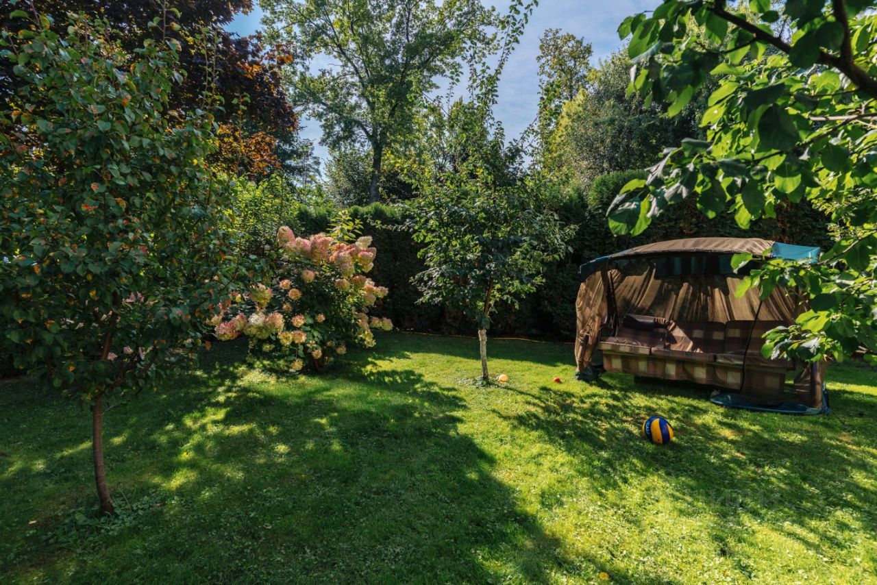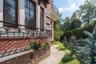 На участке проведены ландшафтные работы: мощение, дренаж, освещение и озеленение- газонная лужайка, живая изгородь из туй, высажены декоративные лиственные и хвойные растения, так же есть плодовый сад. В приватной части участка стоит небольшой дом для проживания персонала и мастерская с зоной хранения.