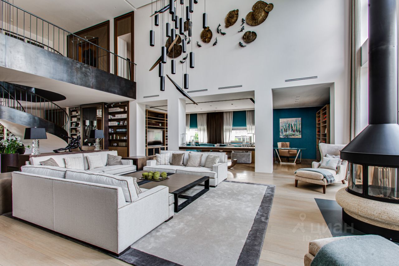 Современный стильный интерьер дополнен красивой мебелью и премиальной сантехникой. Для внутренней отделки использовались натуральные материалы: оникс и дерево. Дизайнерская винтовая лестница украшает потрясающее убранство особняка.