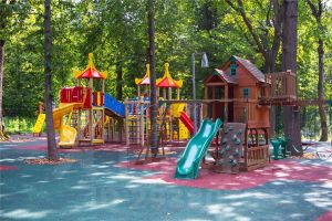 Участок засеян газоном, оформлены клумбы, проложены дорожки, установлено уличные фонари, растут хвойные деревья.