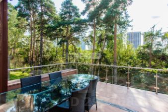 Таунхаус площадью 660 м² на участке 10 соток с лесными деревьями и высаженным газоном. Дом имеет 3 уровня, 4 спальни и 5 санузлов. Интерьер выполнен с отделкой и меблировкой.