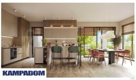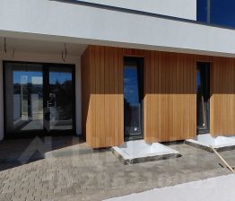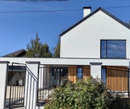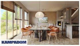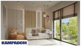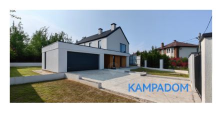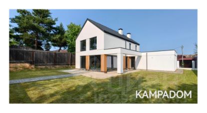 Выступающий перед входной зоной гараж, а также оформленная со стороны сада терраса и зона барбекю, интересно интегрированные в корпус постройки, придавая ей необычную форму. Современный характер дома подчеркнут соответствующей отделкой фасада, модные цвета штукатурки и натуральная облицовка создают эффектную и элегантную композицию. В пространство зоны первого этажа гармонично вписаны уютная гостиная с камином, столовая и кухня. Панорамное раздвижное остекление плавно соединяет интерьер с садом и является эффектным элементом аранжировки. В трехсот метра Cambridge school, спортивный комплекс.