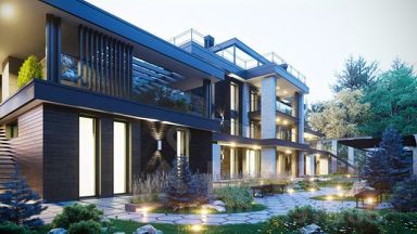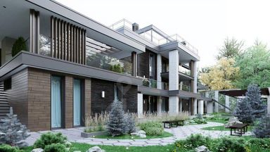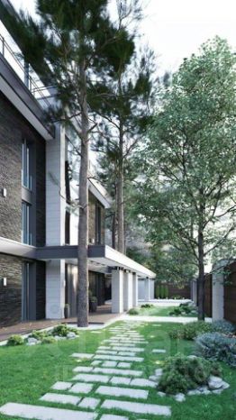 2-й этаж: блок со спальней, гардеробной, ванной комнатой, гостиной с рабочей зоной; три спальни, 2 с/у, постирочная, домашний кинотеатр; также предусмотрено размещение бассейна с зоной SPA.