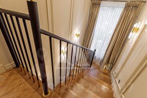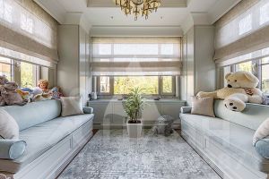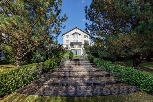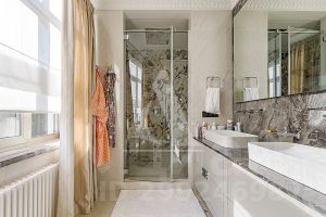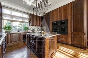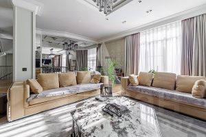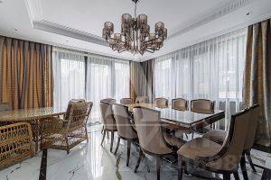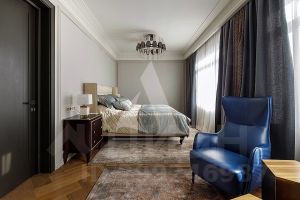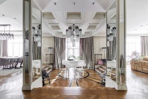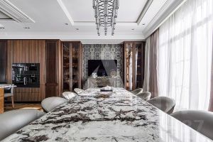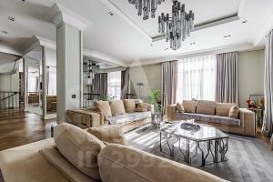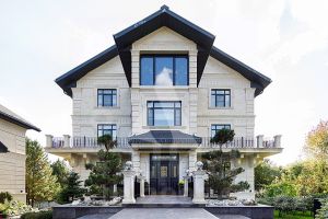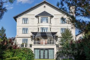 Фасад в неоклассическом стиле выполнен из бежевого камня. Изысканный интерьер сочетает элементы классики и современных дизайнерских решений, в оформлении использованы светлая теплая палитра оттенков, зеркала и фактура дерева.
