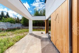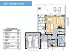 1 этаж - просторная гостиная с панорамным остеклением, кухня, спальня, санузел, холл, гардеробная комната, гараж на 2 автомобиля, 2 террасы.