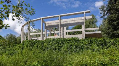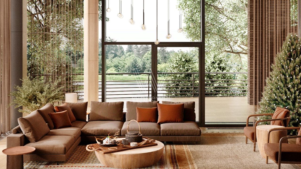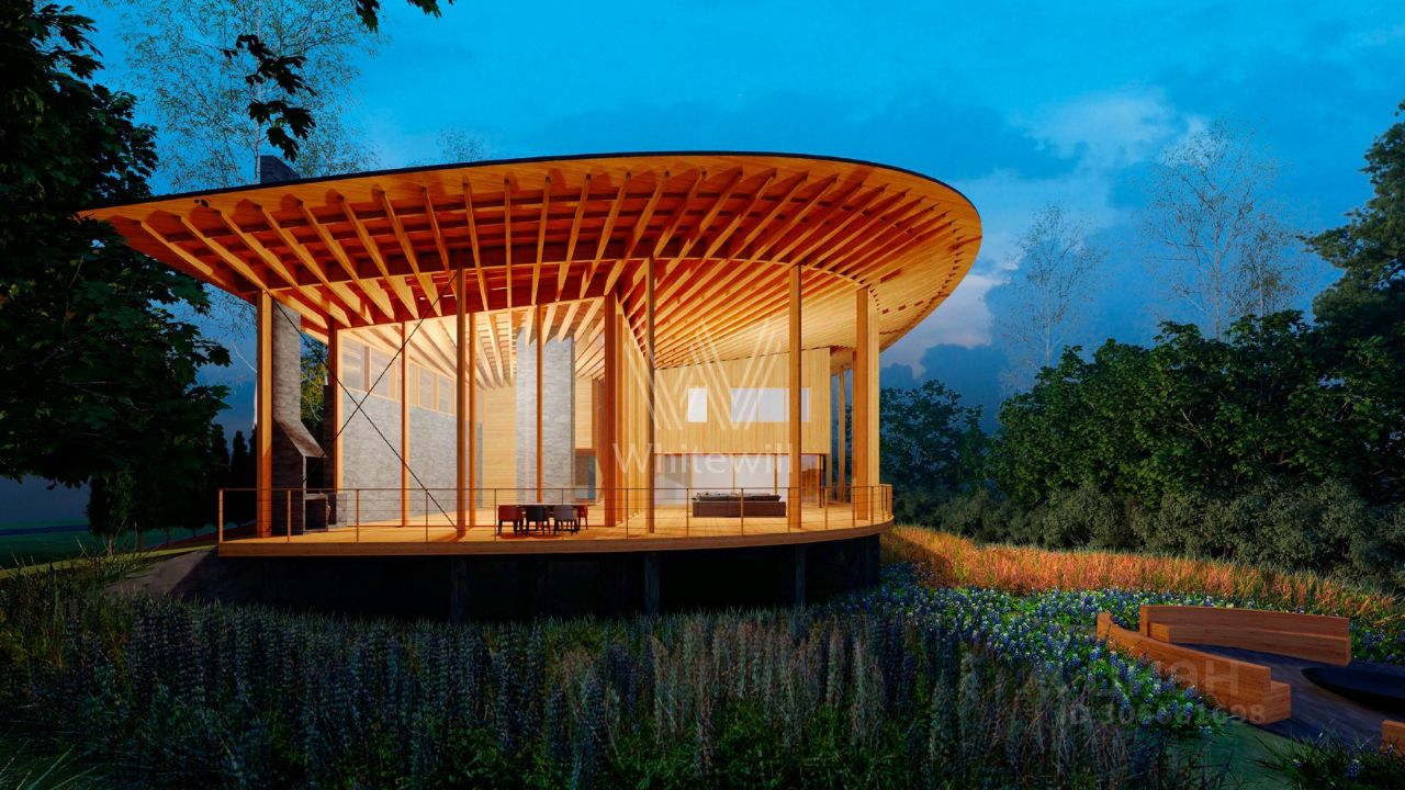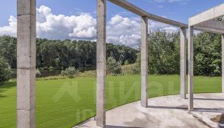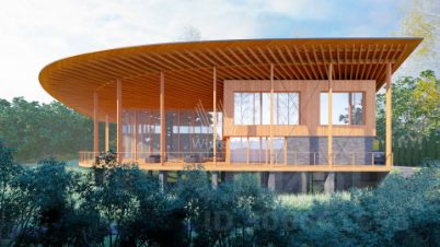 Уборы. Загородный дом без отделки площадью 700 м² расположен на полевом участке 25 соток рядом с водоемом. Архитектура с плавными линиями гармонично вписывается в природный ландшафт. Фасад облицован деревом и клинкерной плиткой. Из панорамных окон открывается вид на водную гладь и сосновый лес. В коттедже спланировали 4 спальни, гостиную с камином и вторым светом, кухню-столовую, кабинет, винный погреб, спортзал и сауну. Предусмотрены гараж на 2 машины и комната персонала. На участке можно высадить деревья и кустарники, оборудовать бассейн и зоны отдыха.