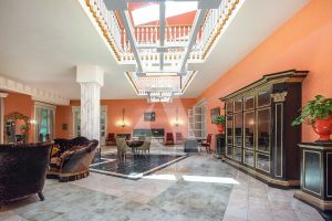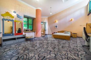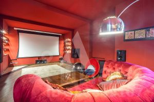 1-ый уровень: холл, огромный каминный зал, столовая, кухня, летняя кухня, спортзал, сауна с джакузи, домашний кинотеатр с баром, гараж с комнатой для персонала, бойлерная, три ванные комнаты, терраса;
