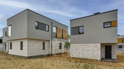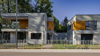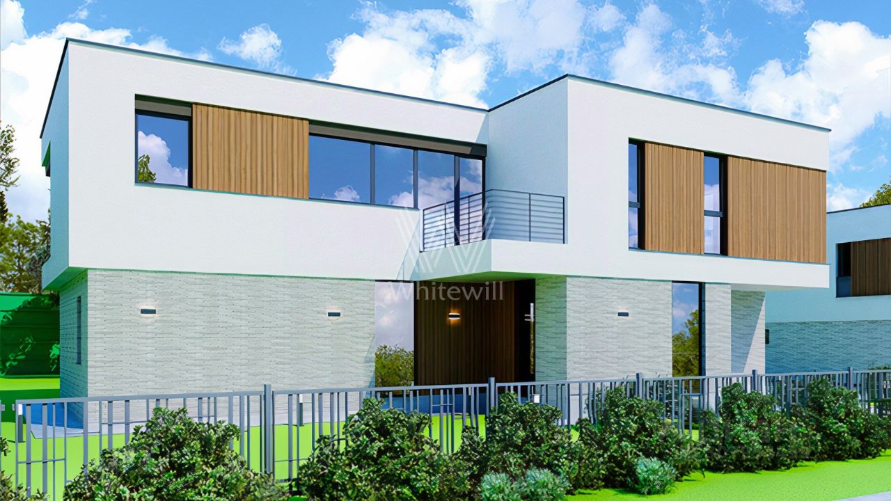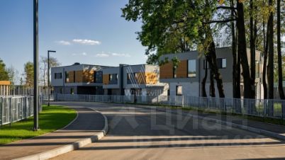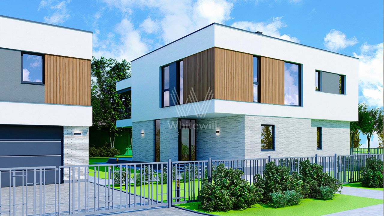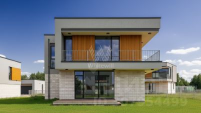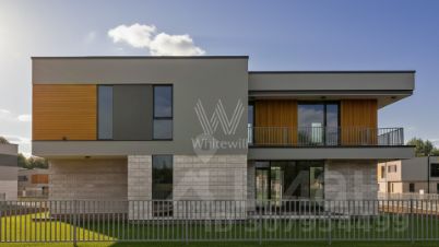 Зайцево Парк. Загородный дом площадью 320 м² построен на полевом участке 12,8 соток. Фасад выполнен в современном стиле и облицован белой штукатуркой, клинкерной плиткой и декорирован вставками под дерево. Коттедж представлен без отделки, что позволяет реализовать индивидуальный дизайн-проект. Участок с газоном окружен изгородью.
