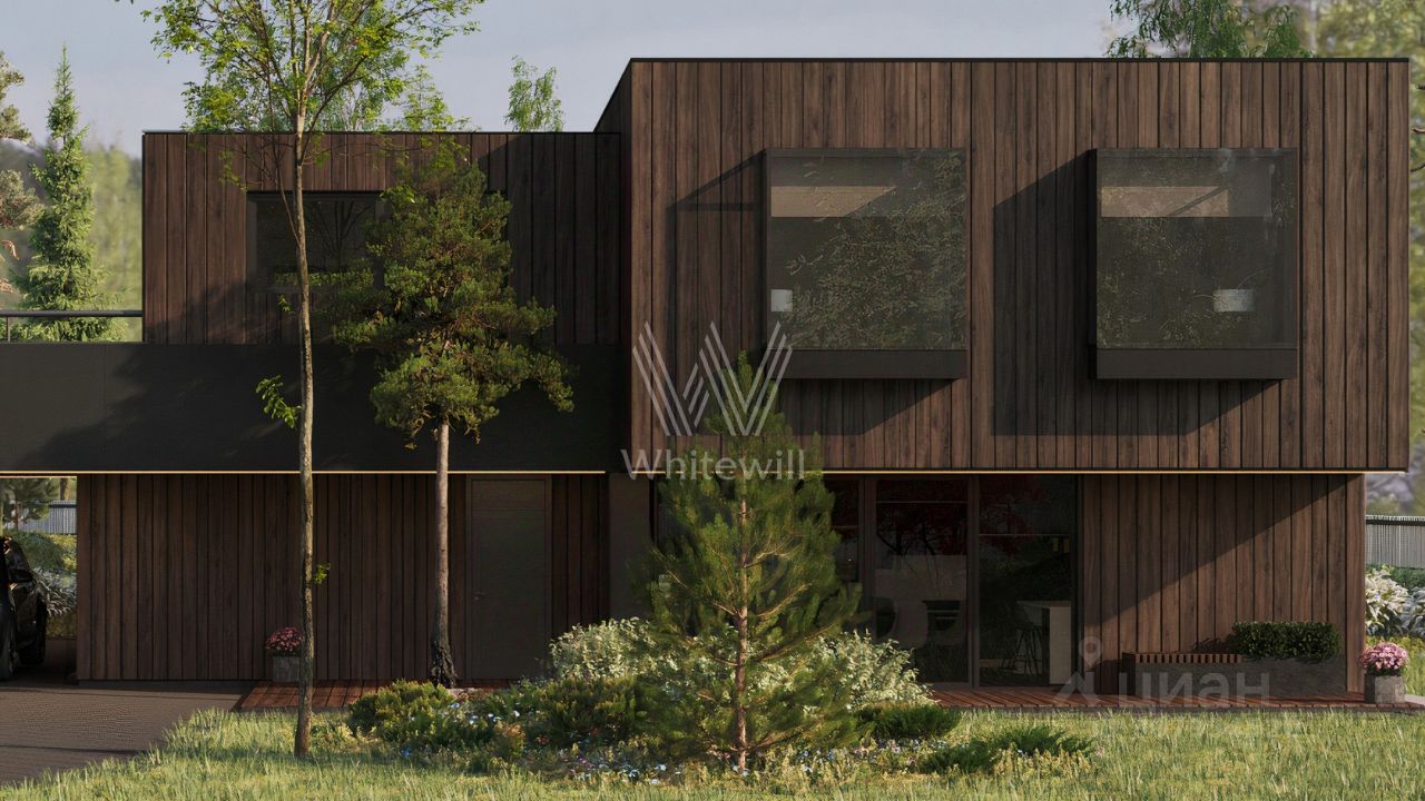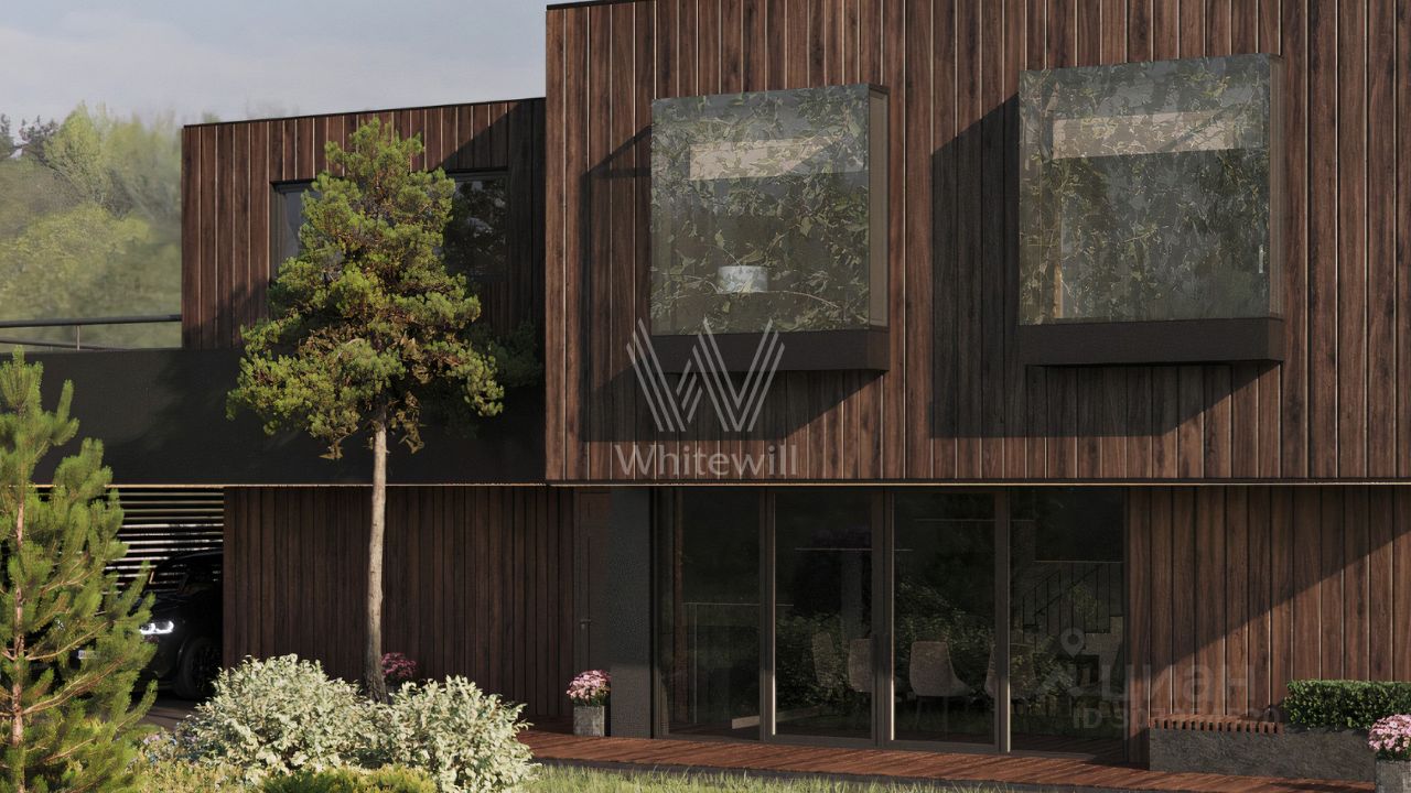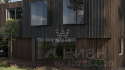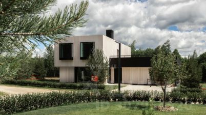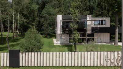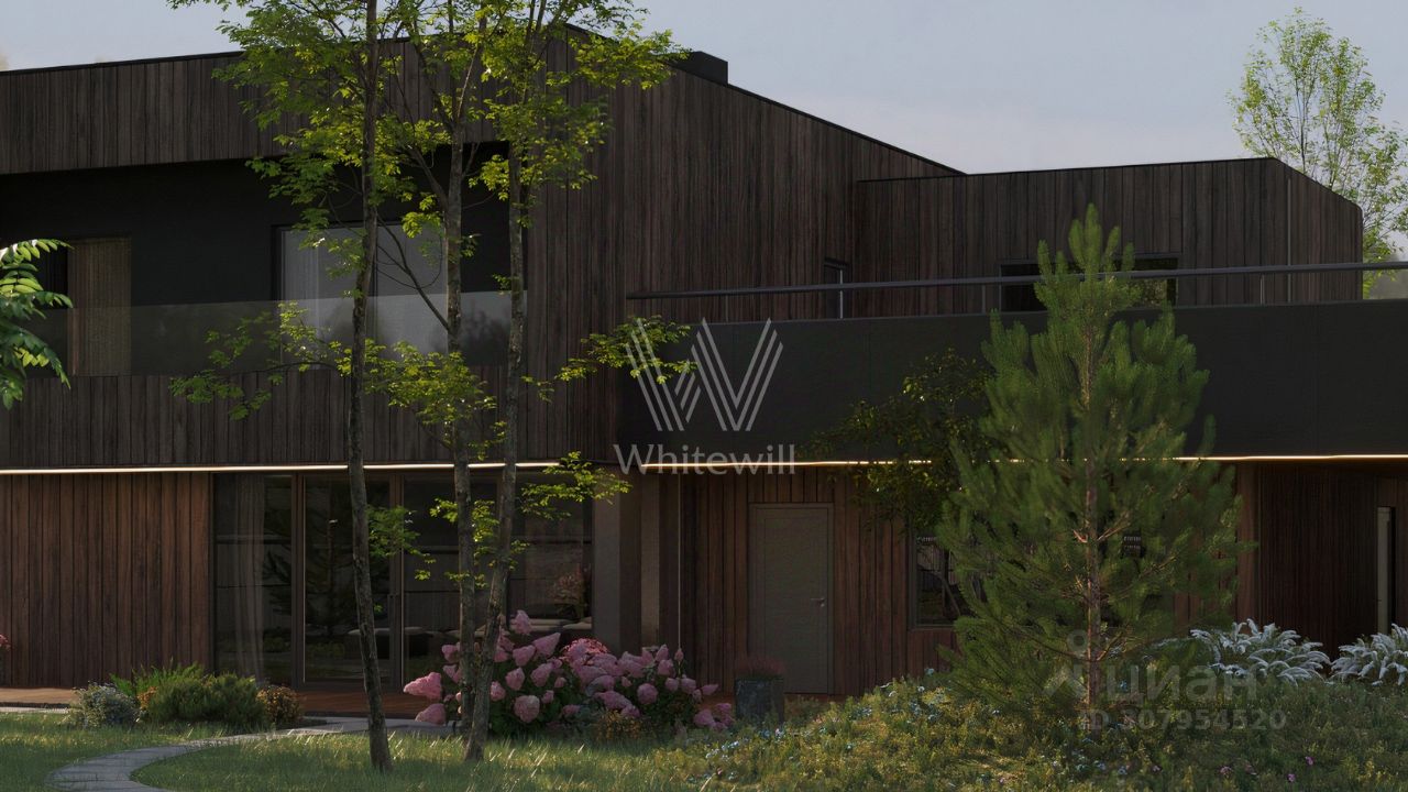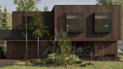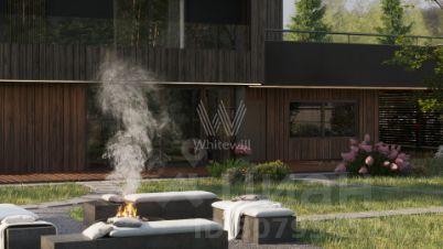 Ильинские холмы. Загородный дом по проекту "L+" площадью 475 м² расположен на полевом участке 14,5 соток. Темный фасад здания облицован лиственницей с заводским покрытием маслом Biofa и декорирован архитектурной подсветкой. Благодаря большой площади остекления и потолкам высоток 2,9 метра внутреннее пространство наполнено воздухом и светом. В коттедже выполнена отделка под ключ. В резиденции разместили 5 спален, гостиную с камином, кухню-столовую, 2 кабинета, комнату отдыха, хаммам и просторную террасу на втором этаже. К дому пристроен навес для машины. На участке выполнен ландшафтный дизайн и оборудована зона отдыха вокруг кострища.